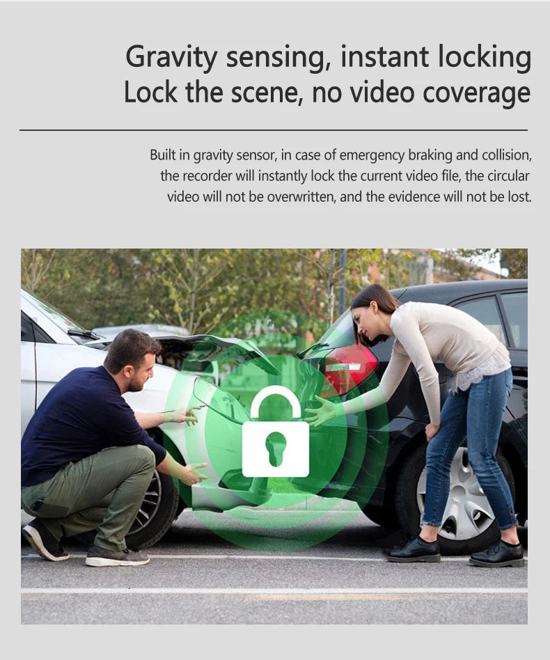 G-Sensor G-Sensor can lock up current DVR recodering during critical moments (such as car accidents), thus protecting your high-quality recordings.