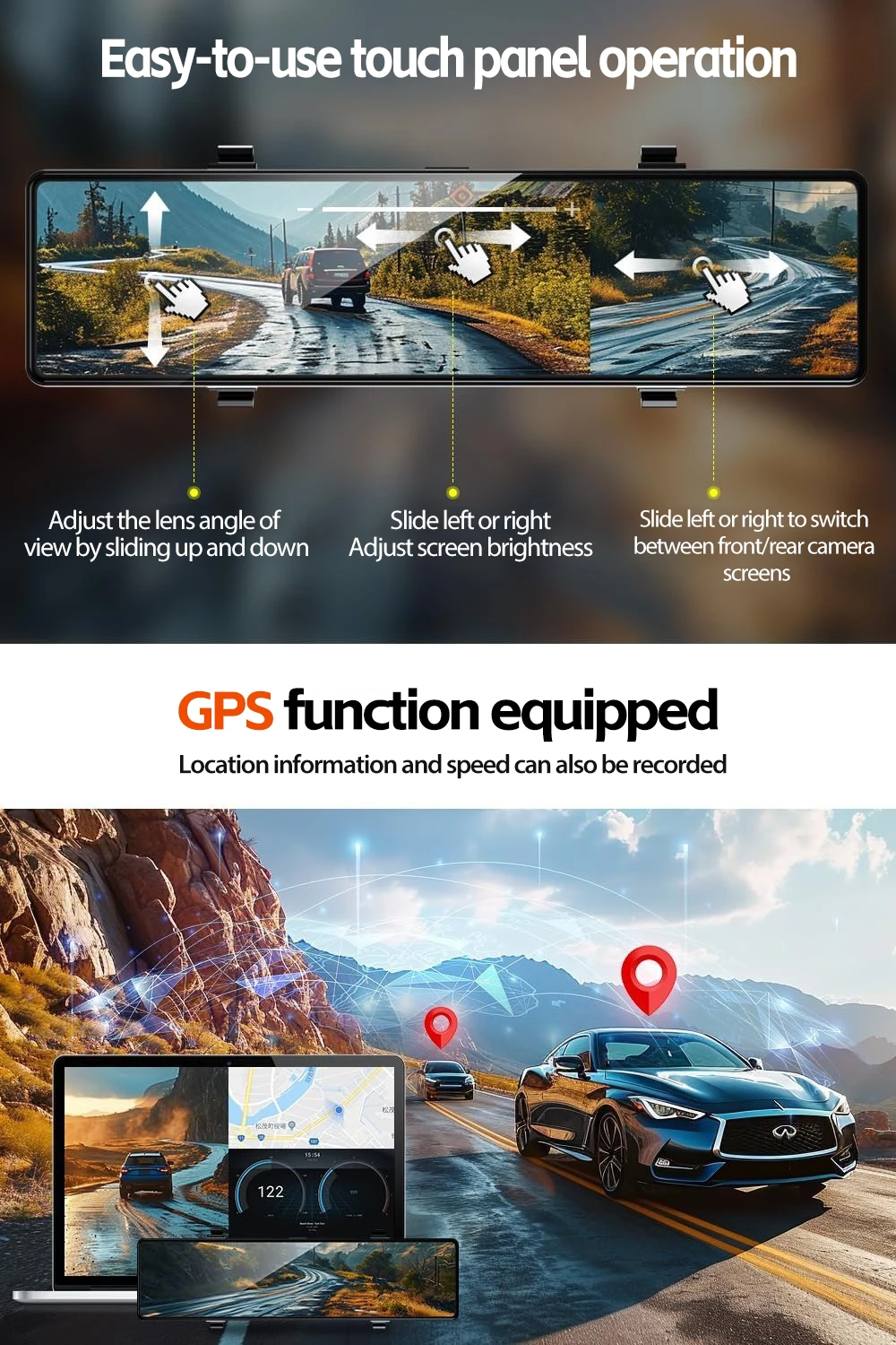 Enjoy an ultra-clear, full touch 12â IPS display. Swipe left or right to easily switch front/rear views. Anti-glare glass ensures readability under sunlight.